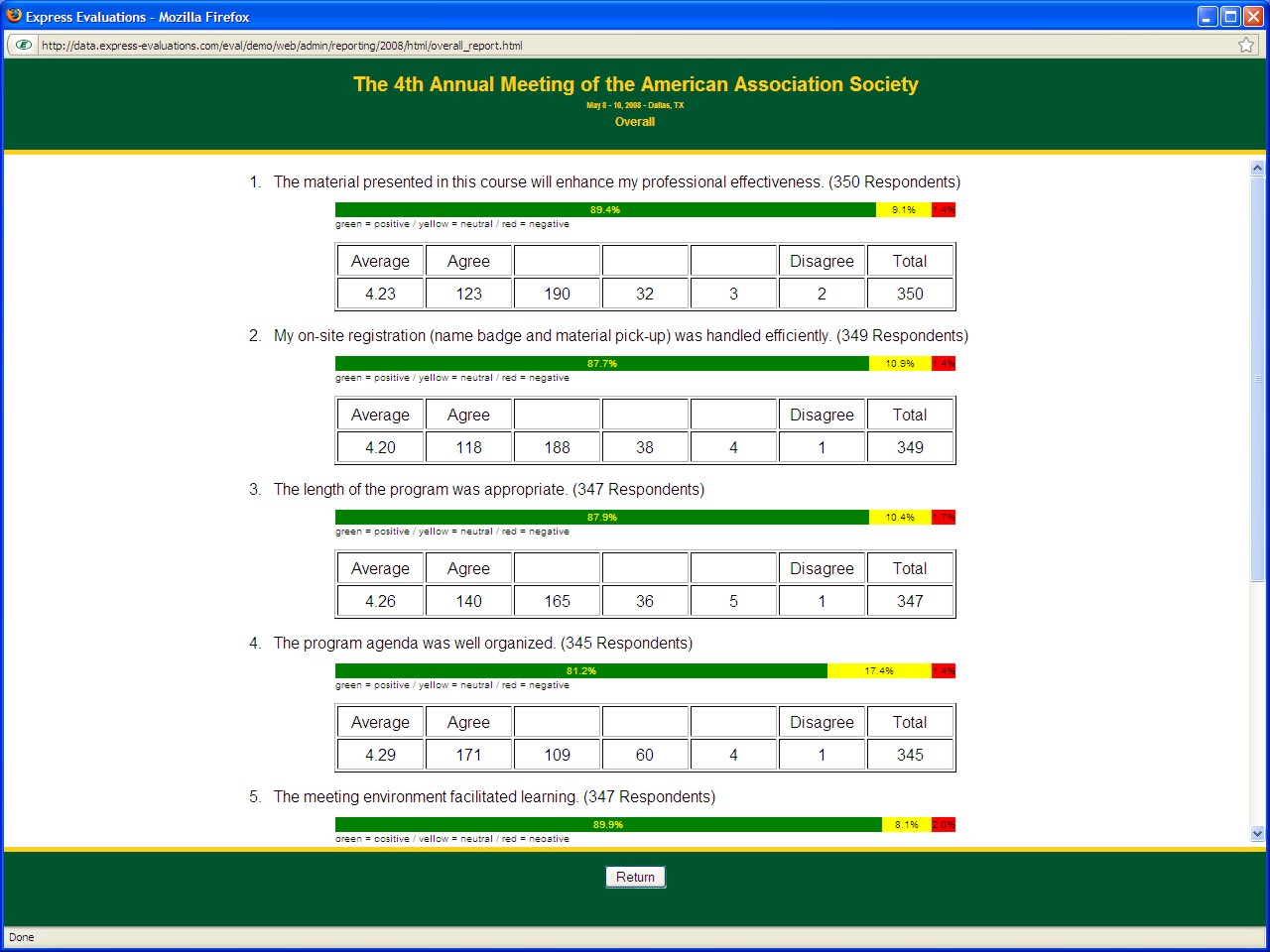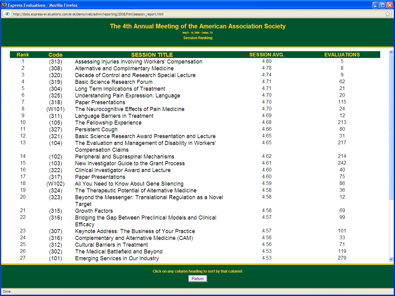 The administration area of the web site provides access to crediting details and copies of individual CE certificates. Standard reports, such as Session/Speaker reports, Session Ranking, Speaker Ranking, Attendee Crediting, and Demographic statistics, will be available on a near real-time basis (updated nightly). Some report examples are detailed below.